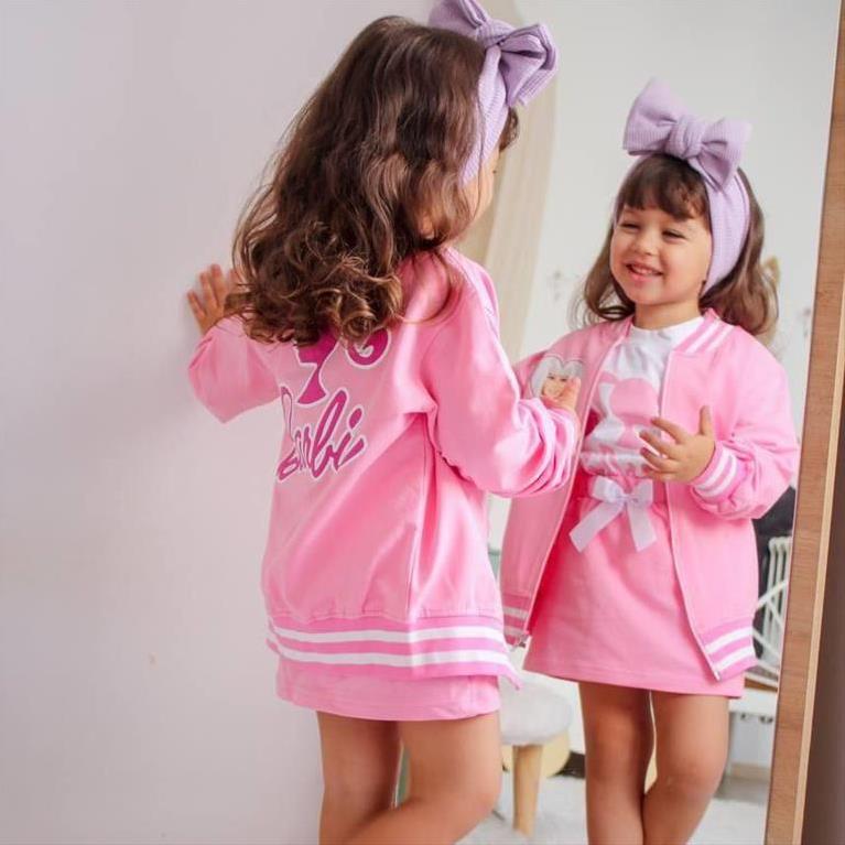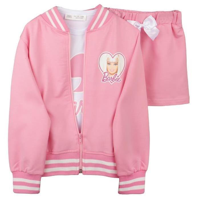 3 تیکه بلوز سفید نخی + سوییشرت صورتی + دامن صورتی کمر کشدارترک